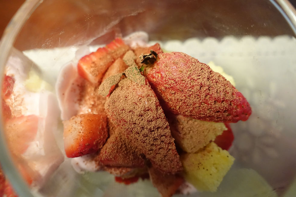 6. Beat the cream until soft peaks with the syrup. Add the chopped strawberries.
